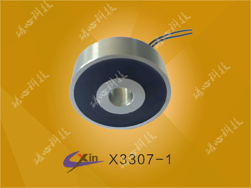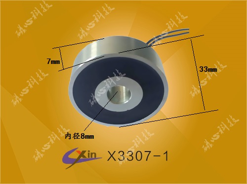 X3307吸盤式電磁鐵采用特殊的結構:產品直徑為33mm,高度為7mm,內置空心線圈,產品體積小,吸力大。產品主要用于小型自動化設備以及玩具產品上。